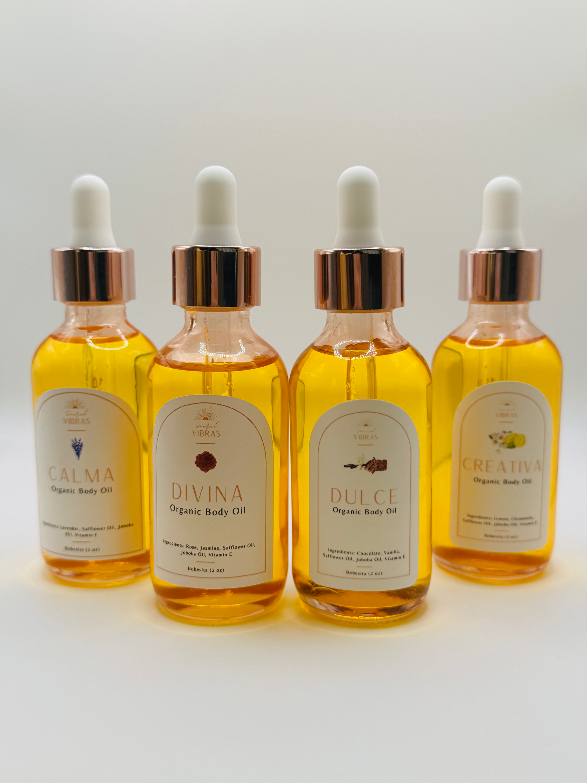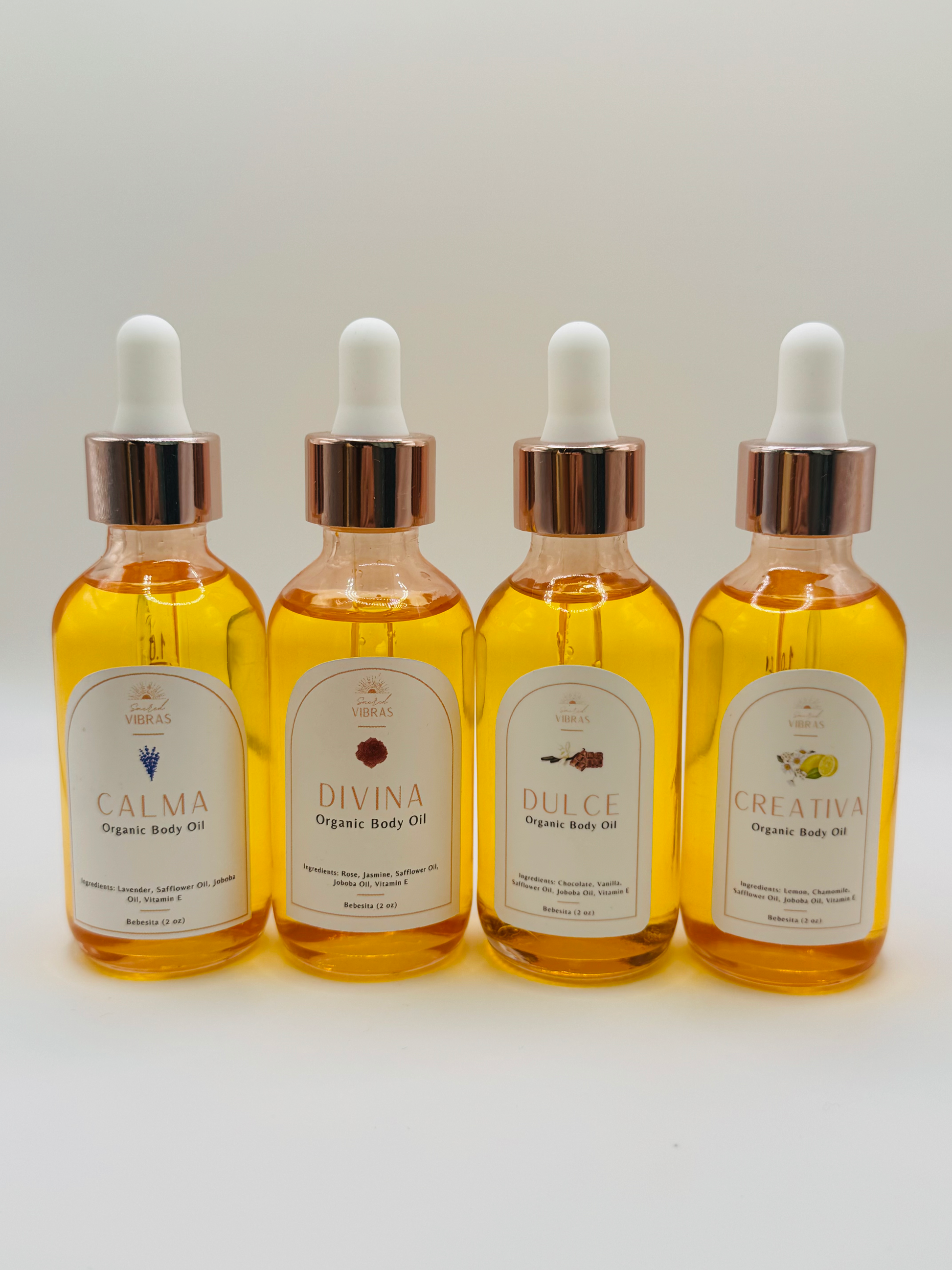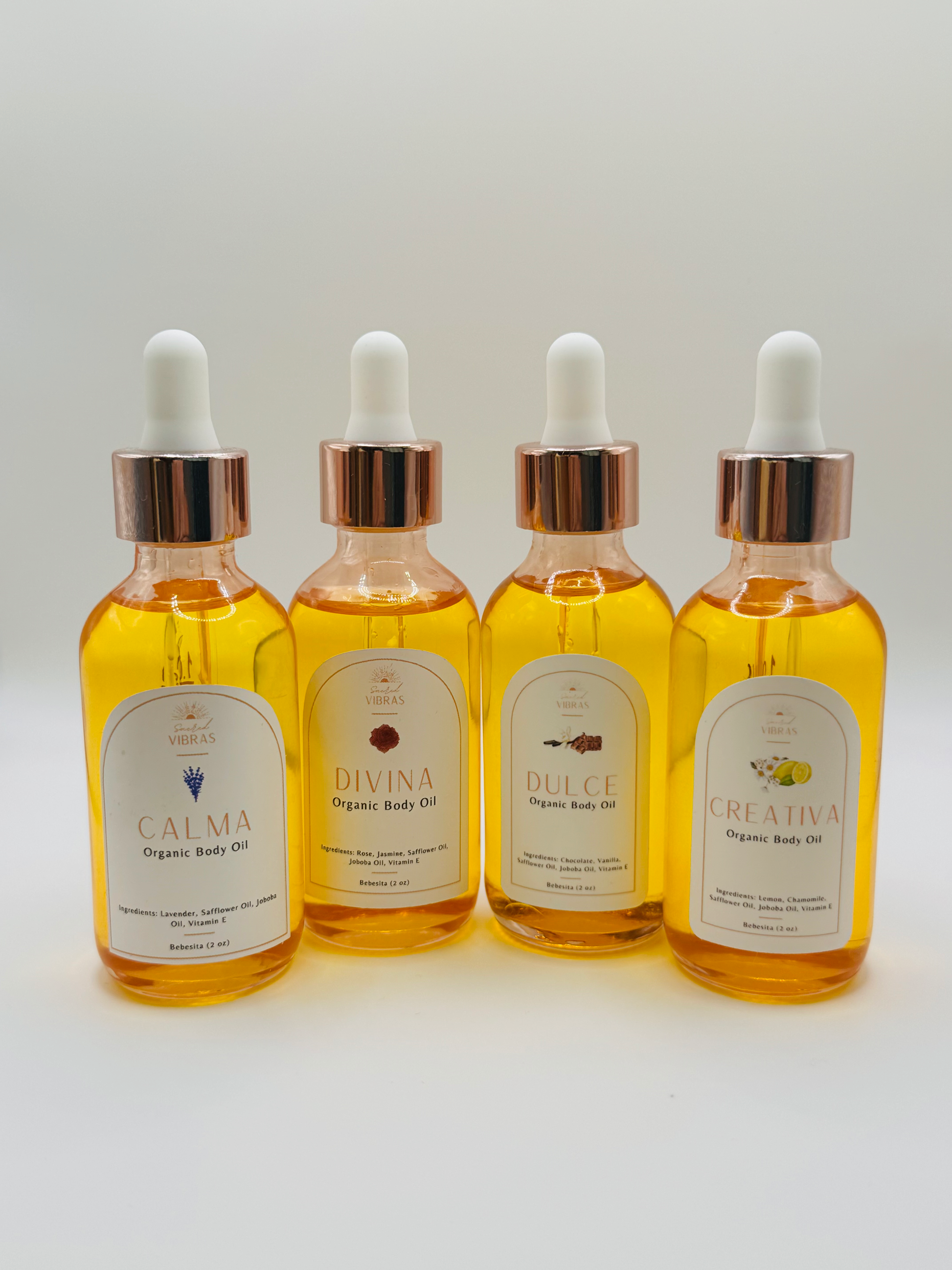 Our holiday bundle includes all four oils—CALMA, DIVINA, CREATIVA, and DULCE—in their Bebesita 2 oz sizes to hydrate, uplift, soothe, and inspire.